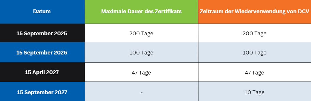 - Validierung der Domainkontrolle: Wie bei DV-Zertifikaten gilt für OV- und EV-Zertifikate der gleiche Zeitplan für die Wiederverwendung der Domainvalidierung. Das bedeutet, dass ab 2028 auch die Domänenvalidierung alle 10 Tage erneut überprüft werden muss.