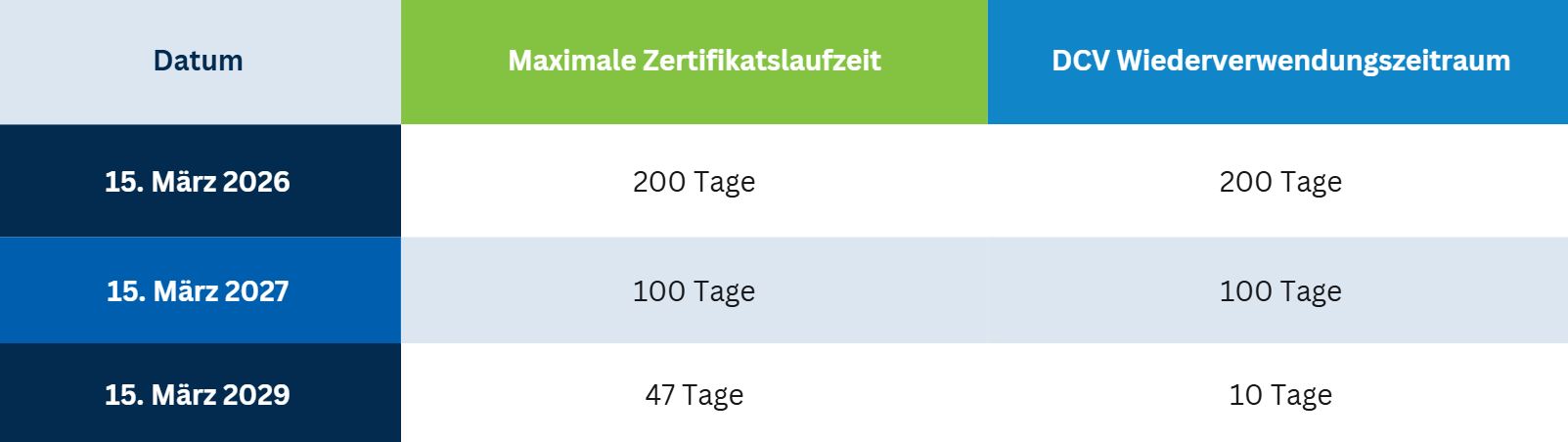 Wenn Sie vor dem 15. März 2026 ein Zertifikat verlängern oder erwerben, können Sie dafür weiterhin die aktuelle maximale Gültigkeit von 398 Tagen erhalten. Nach diesem Datum gelten für neue Zertifikate die kürzeren Laufzeiten gemäß dem Zeitplan des CA/B-Forums, beginnend mit einem Maximum von 200 Tagen.