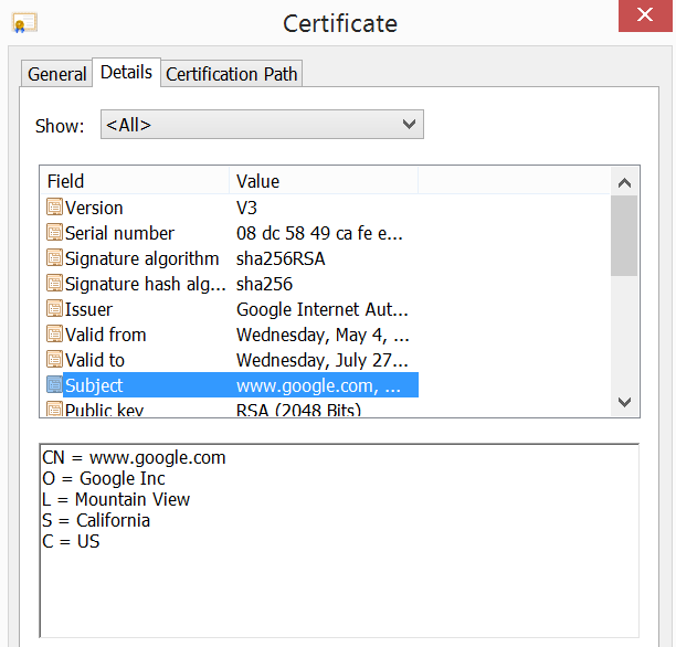 Beispiel für OV-Zertifikatdetails in Chrome. Sie erkennen die Unternehmensinformationen in der Betreffzeile.