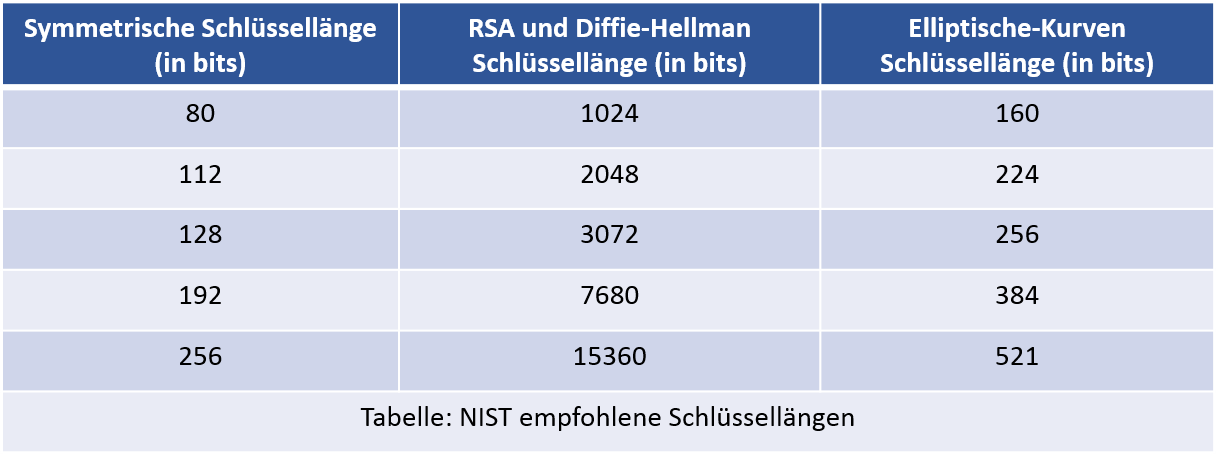 Wie Sie der obigen Tabelle entnehmen können, liefert ECC die gleiche Verschlüsselungsstärke wie ein RSA-basiertes System auch für kürzere Schlüssellängen. Zum Beispiel entspricht ein ECC-Schlüssel mit 256 Bit einem RSA-Schlüssel mit 3072-Bit (was 50% länger ist als die heute üblicherweise verwendeten Schlüssel mit 2048 Bit). Die neuesten von TLS verwendeten symmetrischen Algorithmen (z.B. AES), die als die derzeit sichersten gelten, verwenden Schlüssel mit mindestens 128 Bit. Es macht also Sinn, dass asymmetrische Schlüssel zumindest diesen Sicherheitslevel bieten.