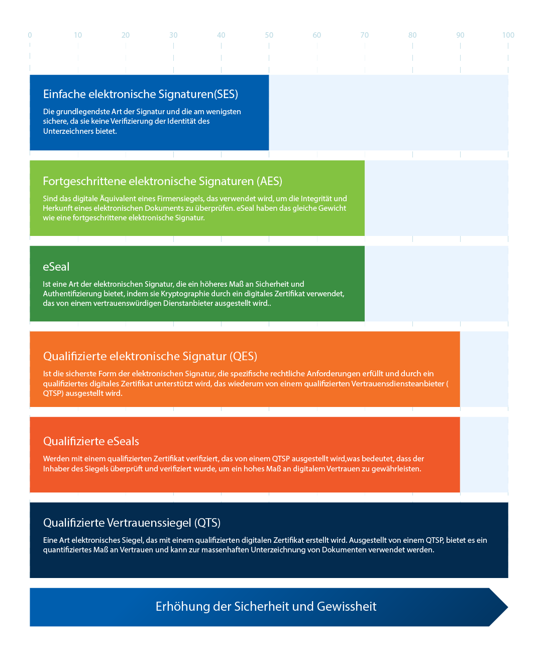 - Qualifizierte elektronische Signaturen - Qualified Electronic Signatures (QES) – Dies ist die sicherste Form der elektronischen Signatur, die bestimmte gesetzliche Anforderungen erfüllt und durch ein qualifiziertes digitales Zertifikat gestützt wird, das wiederum von einem Qualified Trust Service Provider (QTSP) ausgestellt wurde.
