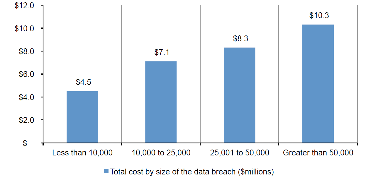 Der diesjährige Ponemon-Bericht zeigt, dass Unternehmen mit Datenpannen, die weniger als 10.000 Datensätze betrafen, durchschnittlich 4,5 Millionen US-Dollar und Unternehmen mit Verlusten oder Diebstählen von mehr als 50.000 Datensätzen 10,3 Millionen US-Dollar ausgegeben haben.