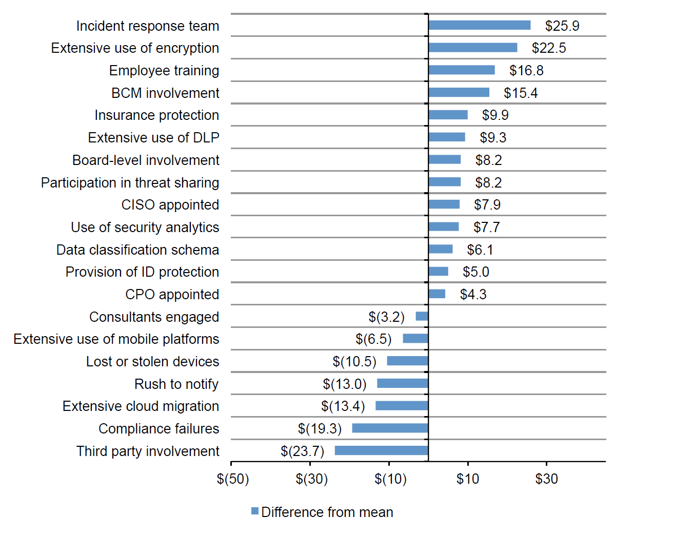 Was sollte das durchschnittliche Unternehmen also tun, um diese Art von Verlust bei einem Cyberangriff einzudämmen oder zu minimieren? Die Leute bei Ponemon haben das auch herausgefunden. Die folgende Grafik zeigt Ihnen, welche Schritte Ihnen helfen, Geld zu sparen und welche vernachlässigten Schritte Sie mehr kosten.