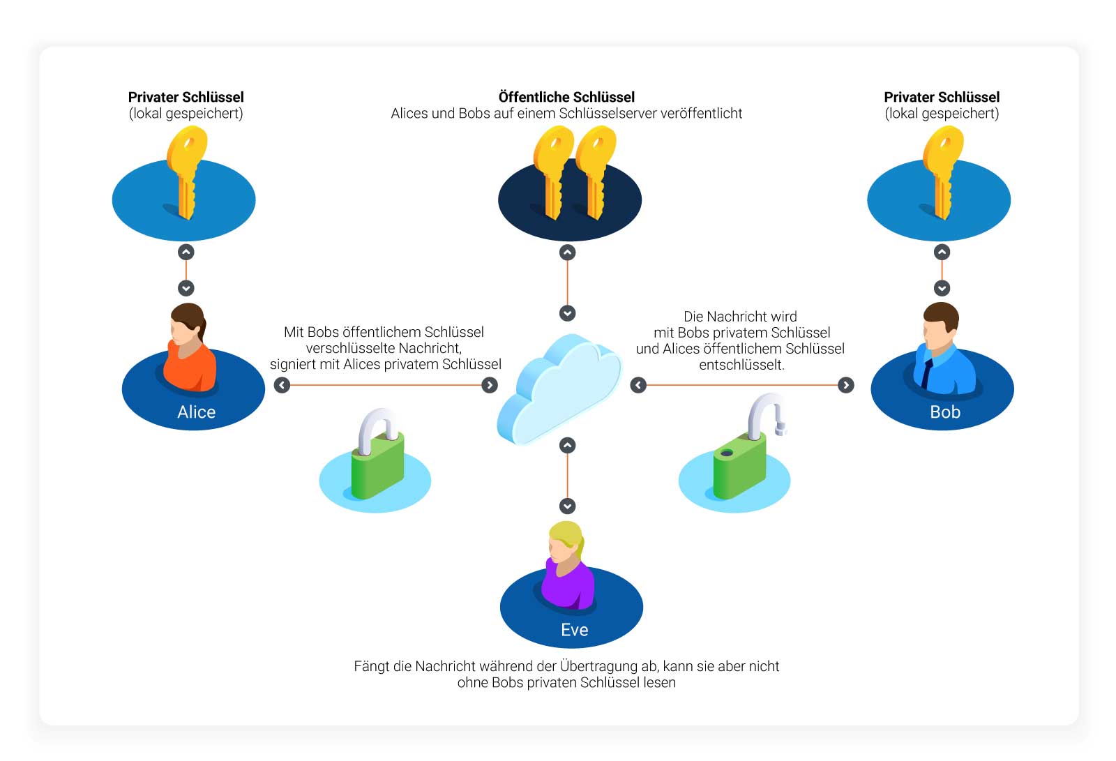 Während dieses Vorgangs überprüft ein digitales Zertifikat, ob der öffentliche und der private Schlüssel dem richtigen Empfänger bzw. Absender gehören.