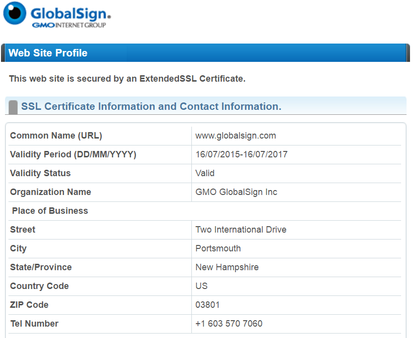 Beispiel für die Identitätsinformationen, die beim Anklicken eines GlobalSign SSL Vertrauenssiegels angezeigt werden.