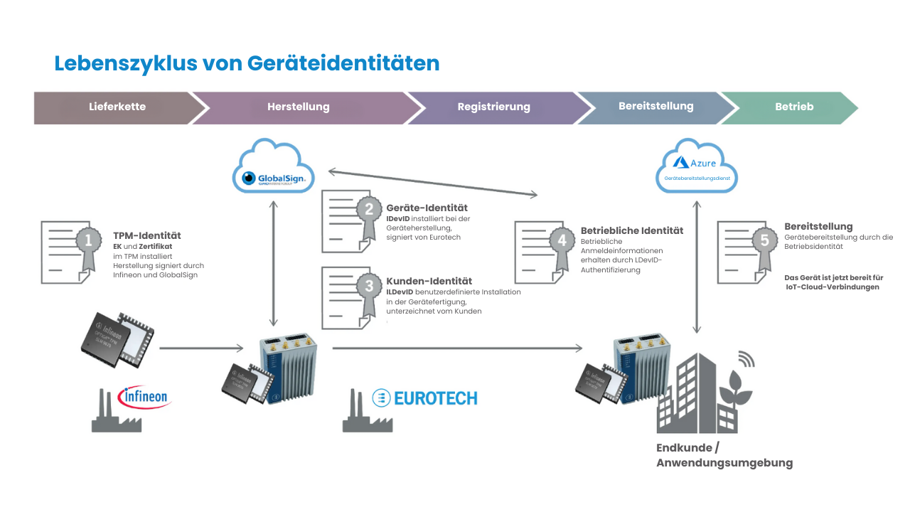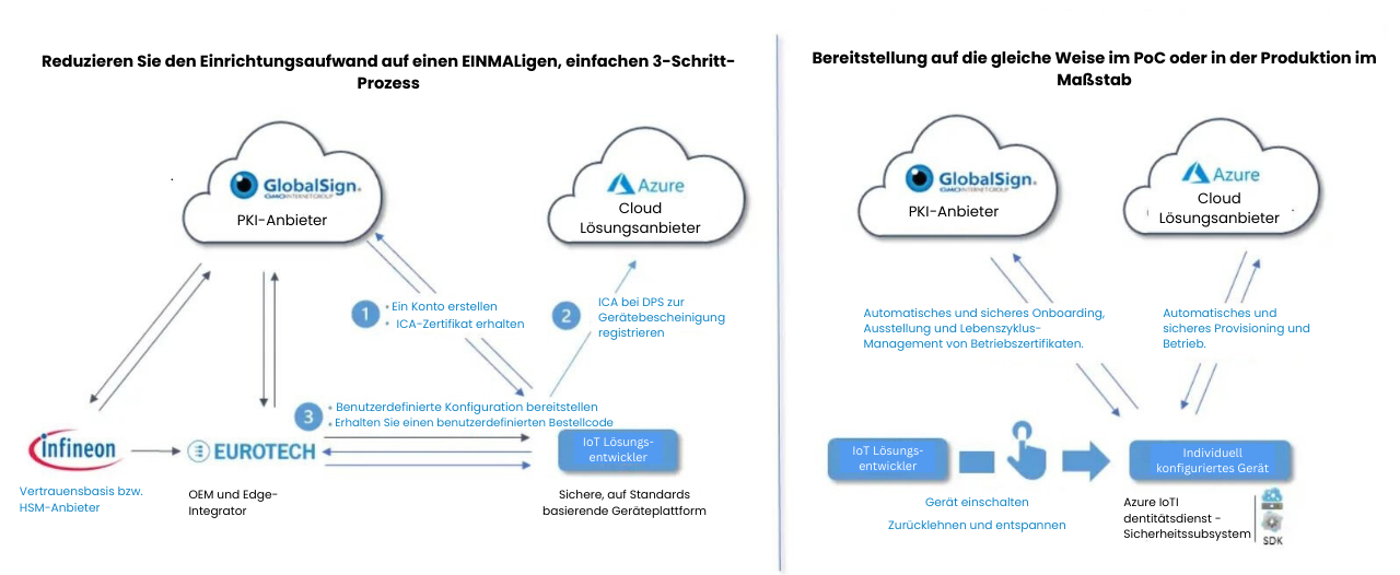 Infineon, GlobalSign, Eurotech, and Microsoft Azure Azure haben zusammengearbeitet, um diese Hindernisse für die IoT-Sicherheit zu beseitigen. Gemeinsam hat diese Partnerschaft eine sichere Zero-Touch-Lösung für die Bereitstellung von IoT-Geräten in der Cloud entwickelt, die in großem Umfang funktioniert und das Risiko von Kompromissen in der Lieferkette verringert..