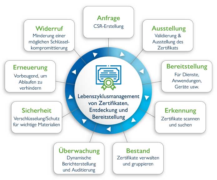 Unsere Verpflichtung zu einer umfassenden Lösung bedeutet auch, dass wir jeden Aspekt des Zertifikatslebenszyklus abdecken – von der Bereitstellung und Ausstellung bis zur Erneuerung und Überwachung. Effizienz und Sicherheit sind dabei unsere höchste Priorität, damit Sie vor abgelaufenen und falsch bereitgestellten Zertifikaten geschützt werden.