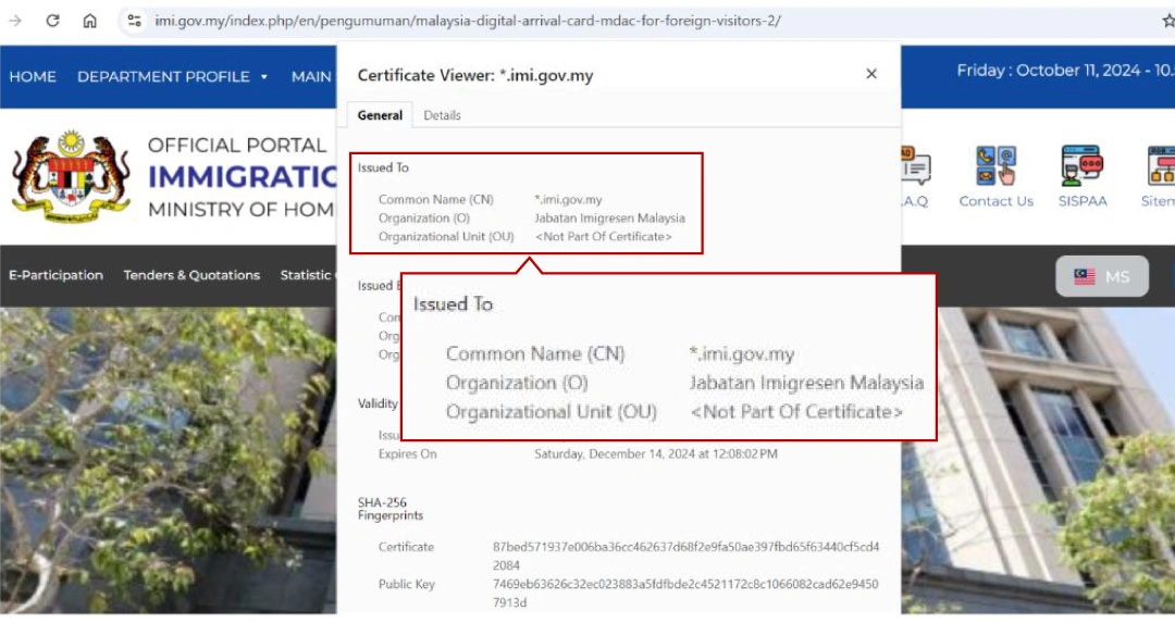 As shown in the official site’s SSL certificate, the organization name (Malaysia Immigration) is clearly stated. Why is this important? When a Certificate Authority issues an organization-level SSL certificate, they conduct a rigorous vetting process to verify the organization's registration information via trusted sources approved by the CA Browser Forum. This ensures that the CA knows exactly who they are issuing the SSL certificate to.