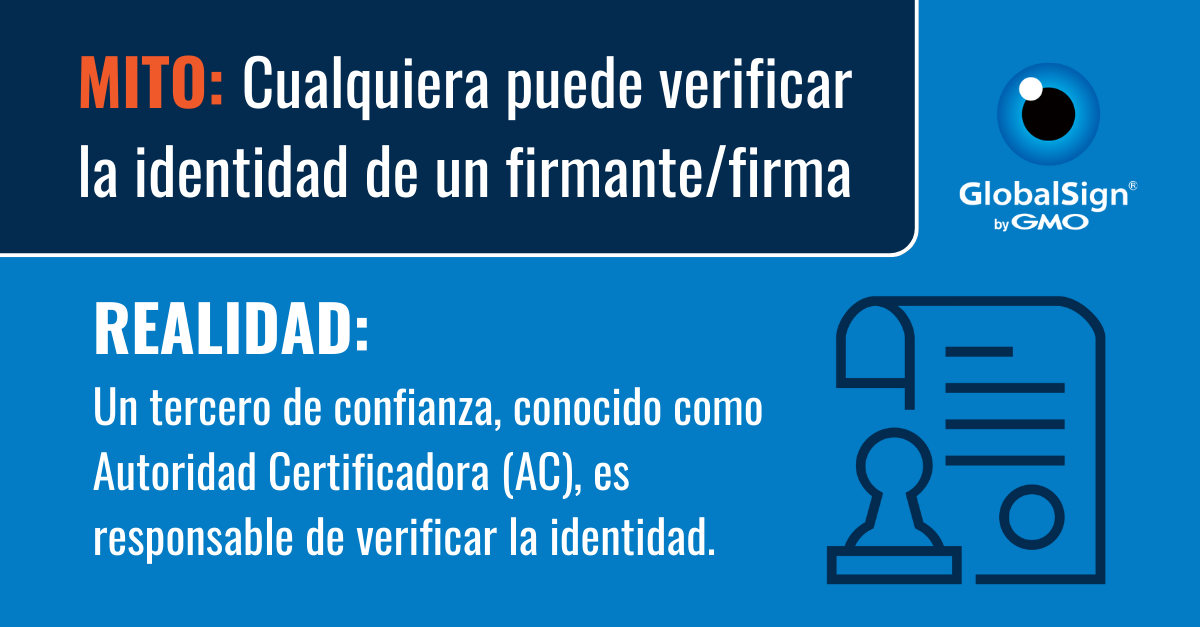 No, no todo el mundo puede verificar la identidad de un firmante o firma. Una firma electrónica verificada se conoce como firma digital y un tercero de confianza, conocido como Autoridad Certificadora (CA), es responsable de verificar la identidad. Las Autoridades Certificadoras vinculan su identidad a un certificado digital basado en PKI que le permite utilizar su certificado para crear firmas digitales.