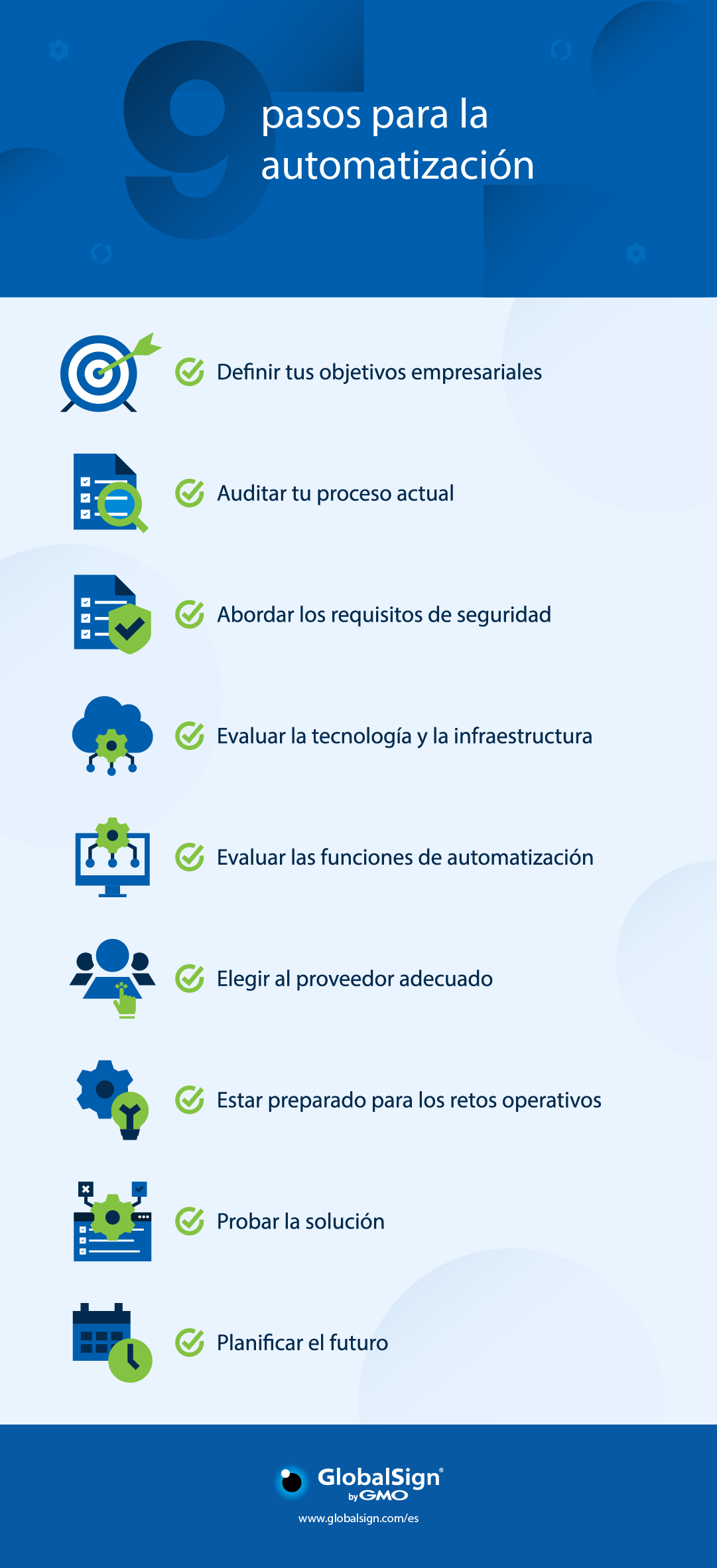 Al utilizar las soluciones de automatización de GlobalSign, puedes asegurarte de que tus procesos de gestión de certificados no solo sean eficientes, sino también seguros y compatibles. Este enfoque proactivo ayudará a tu organización a navegar por el cambiante panorama digital con confianza, reduciendo el riesgo de interrupciones y violaciones de seguridad.