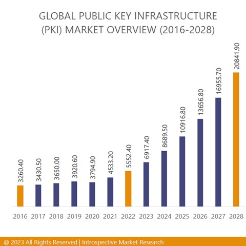 La PKI ofrece numerosas ventajas para proteger la identidad digital de una empresa, razón por la cual cada vez más empresas están adoptando esta tecnología, como se desprende del estudio de mercado sobre PKI, según el cual se prevé que el mercado alcance los 20.841,90 millones de dólares en 2028, frente a los 5.552,40 millones de dólares en 2022, con una tasa de crecimiento anual compuesto del 20,18%.