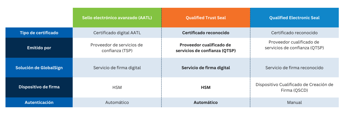 Con la introducción de un nuevo nivel de eSeal, la siguiente tabla desglosa las principales diferencias entre estas soluciones de firma: