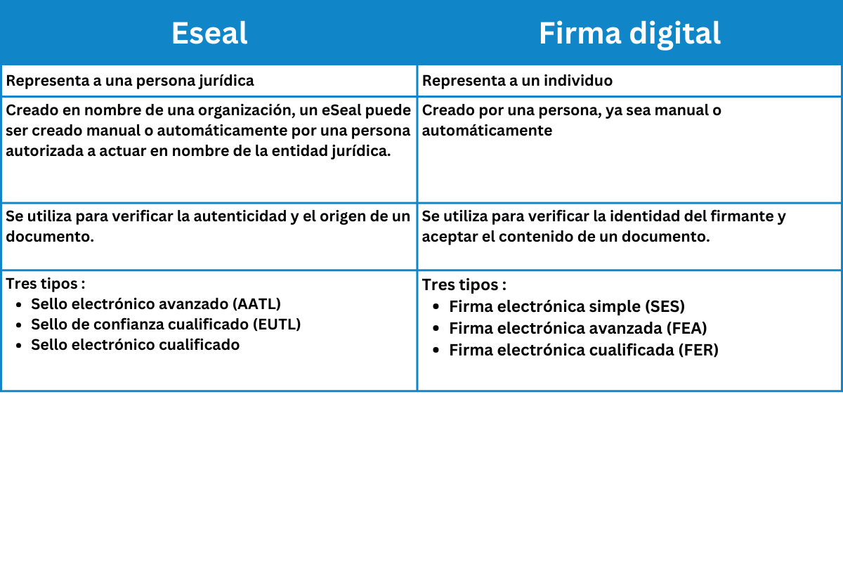 Mientras que una firma digital se utiliza para representar a una persona física, un sello electrónico representa a una entidad jurídica u organización. El uso tanto de la firma digital como del sello electrónico tiene una finalidad común, pero también hay una serie de diferencias fundamentales: