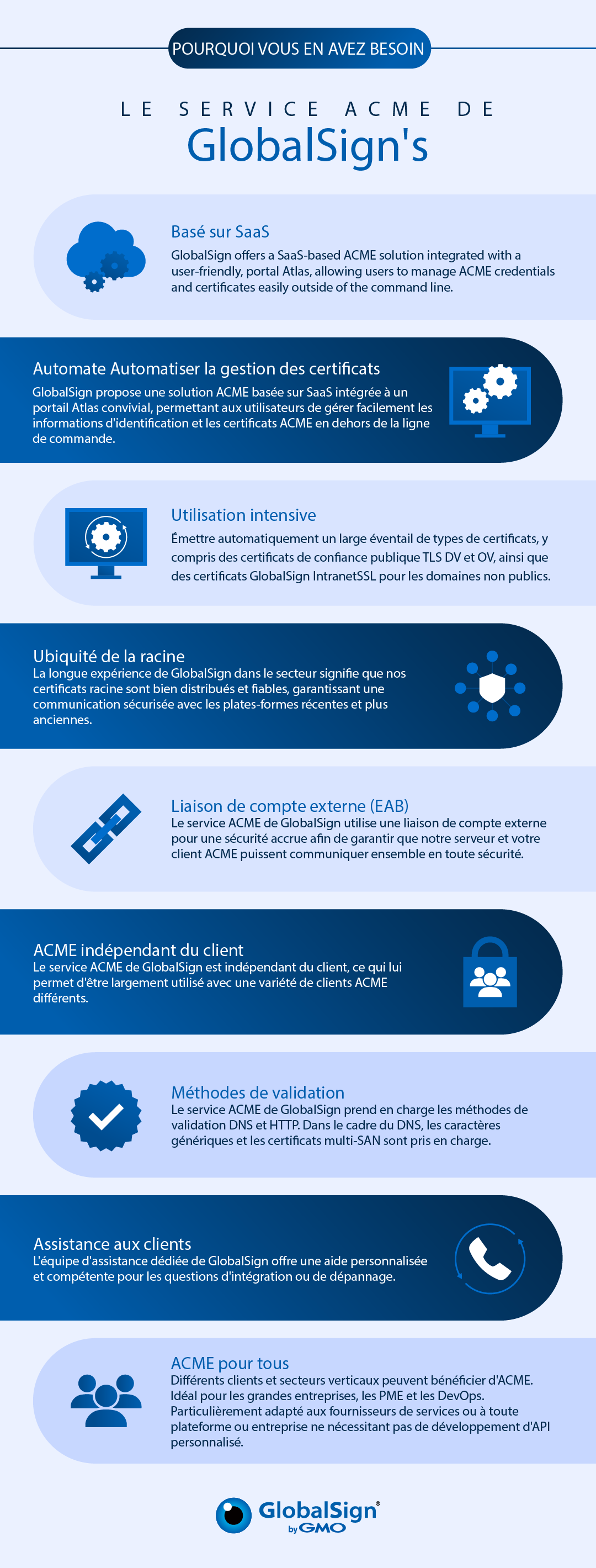 GlobalSign propose un service ACME fiable qui permet aux équipes IT de simplifier leur gestion de certificats et de muscler leur stratégie de sécurité. Pour en savoir plus et échanger avec nos équipes, contactez-nous dès maintenant.