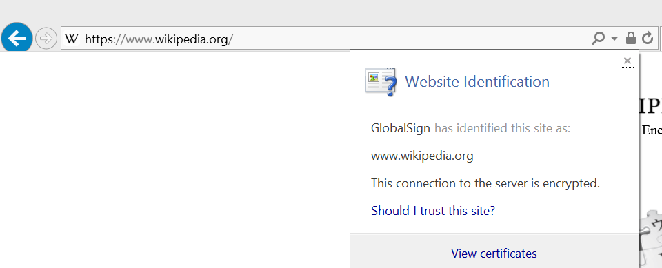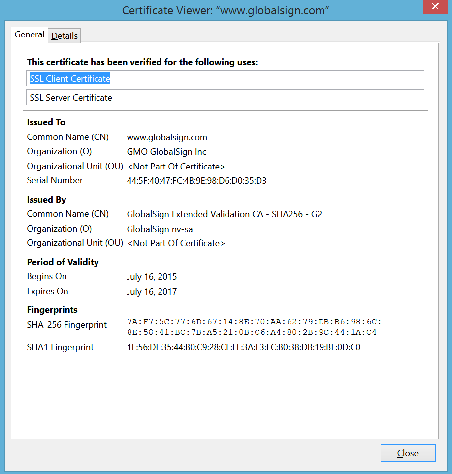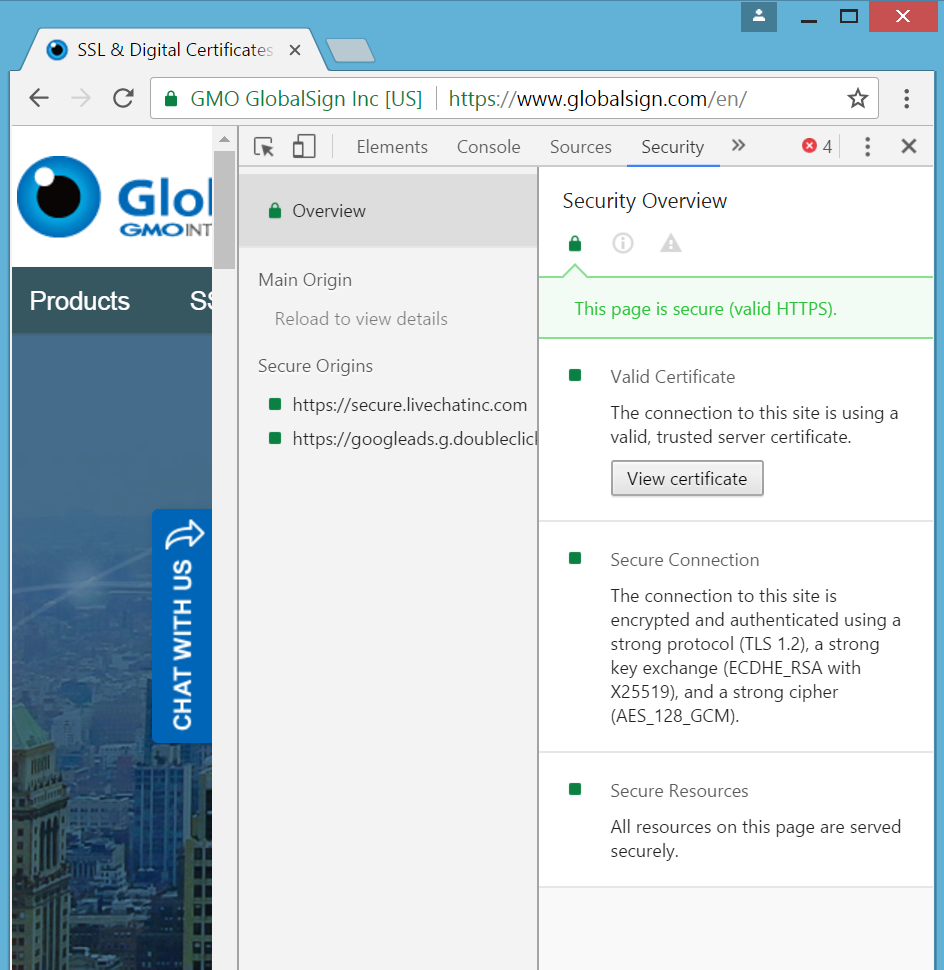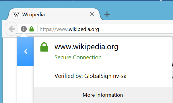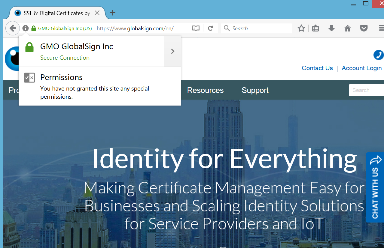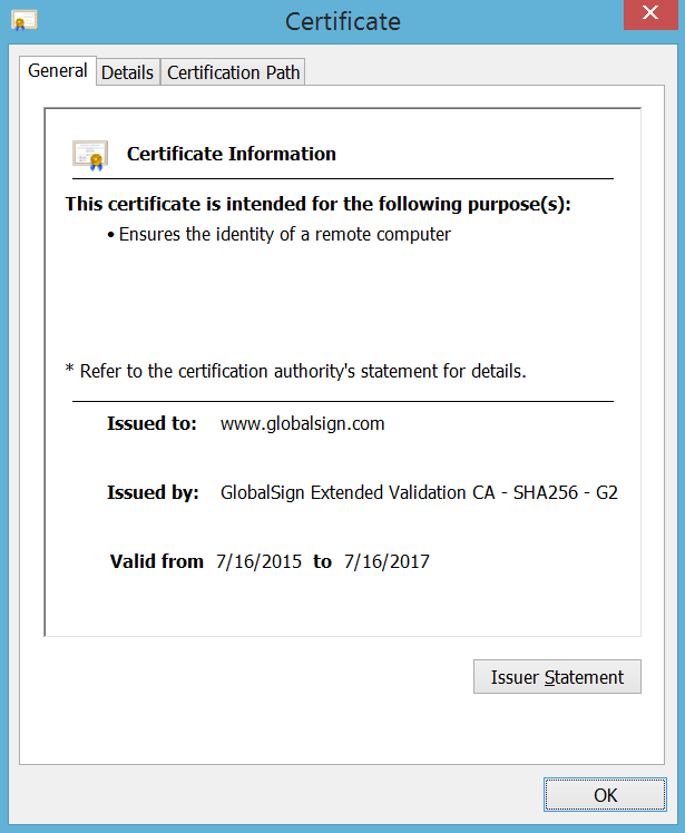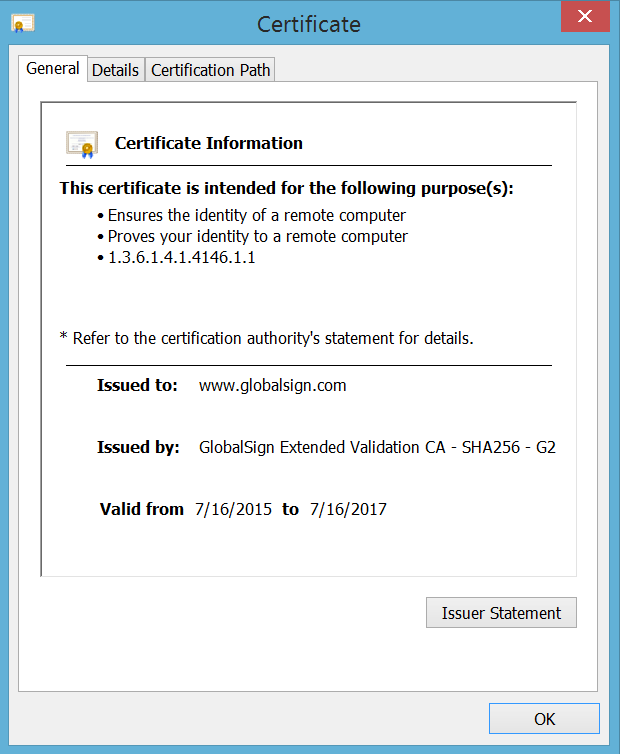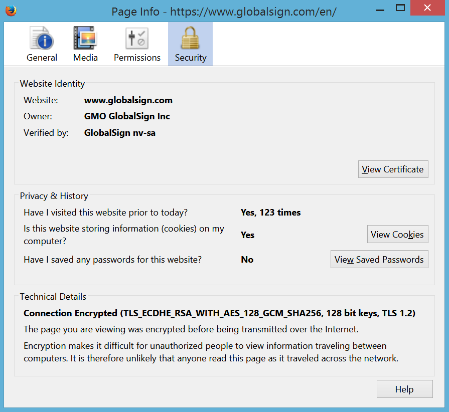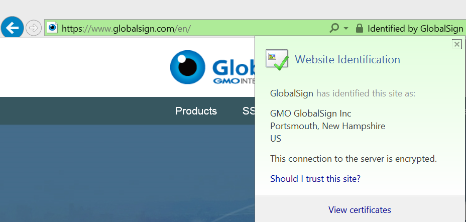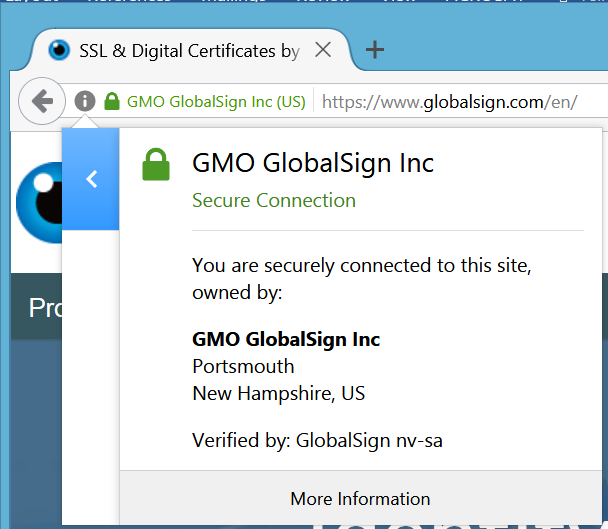 1. Cliquez sur le cadenas pour faire apparaître le nom de l’AC émettrice (GlobalSign has identified this site as: [« GlobalSign a identifié ce site comme étant : »]) et une note précisant que la connexion au serveur est chiffrée. D’autres éléments d’identification s’affichent, mais là encore, cela varie en fonction du type de certificat (EV et autre qu’EV, c’est à dire DV ou OV). Les certificats EV contiennent le nom de la société et sa localisation, alors que les certificats DV et OV n’affichent que le domaine.