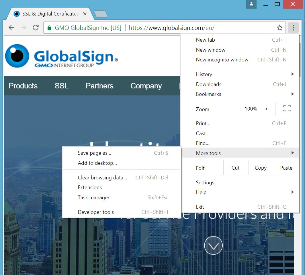 1. Cliquez sur les trois points verticaux à droite de la barre d’adresse. Allez à More tools (« Plus d’outils ») et sélectionnez Developer tools (« Outils de développement »). Remarque : vous pouvez aussi y accéder en cliquant sur F12.