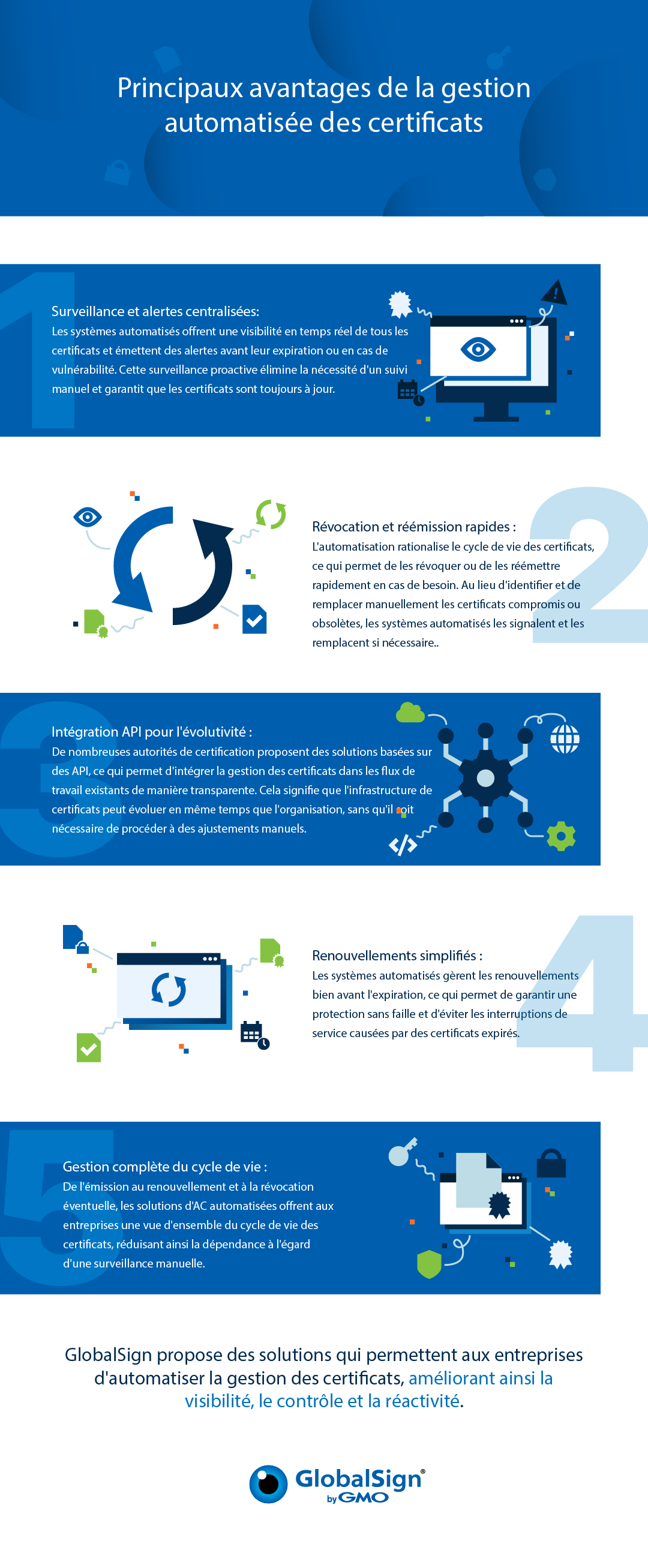 Les autorités de certification (AC), comme GlobalSign, proposent des solutions qui permettent aux entreprises d’automatiser la gestion de leurs certificats et d’améliorer la visibilité, le contrôle et la réactivité face aux risques potentiels. Zoom sur les principaux avantages de ces systèmes automatisés :