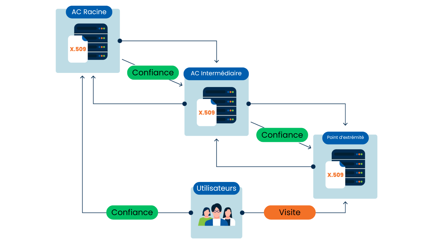 La chaîne de confiance est une série de certificats. Cela commence par un certificat racine d’une fiabilité extrême, suivi de certificats intermédiaires puis d’un certificat final. En résumé :