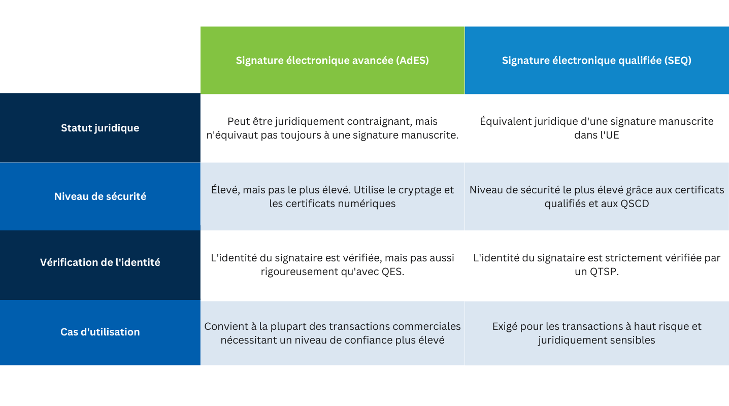 - Ce qu’il faut savoir : La protection des données et le chiffrement sont essentiels dans le cadre de signatures électroniques avancées et de signatures électroniques qualifiées. Les QES respectent toutefois des normes plus strictes.