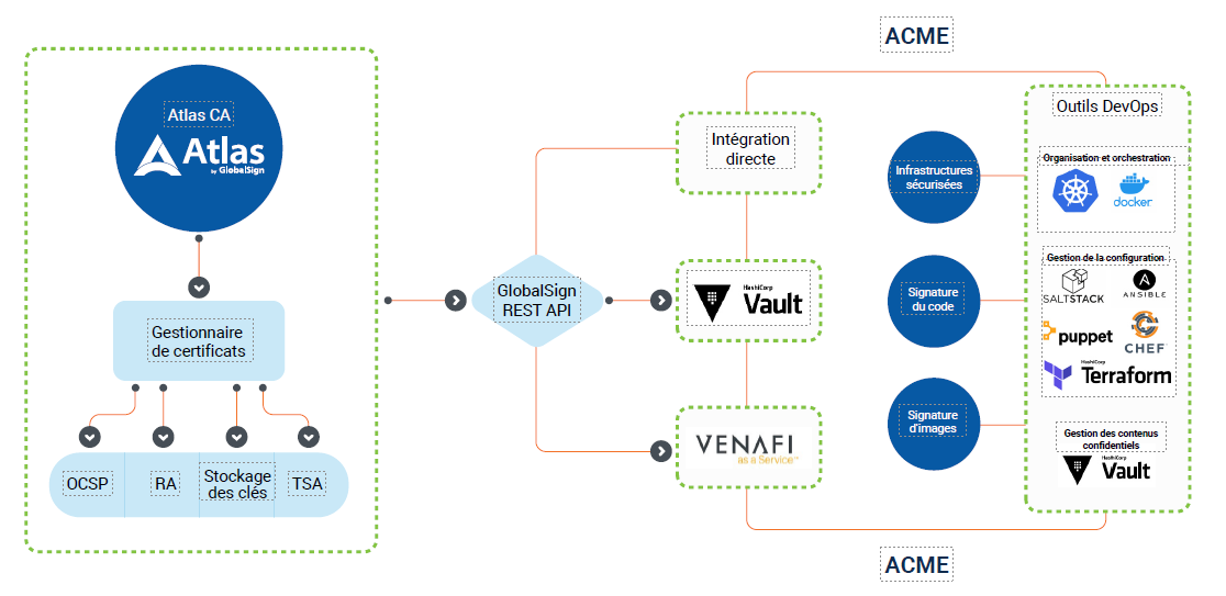 Les solutions intégratives telles que le protocole ACME assurent la sécurité de votre chaîne d'outils, y compris les outils de gestion des conteneurs et des secrets tels que Kubernetes et Hashicorp Vault