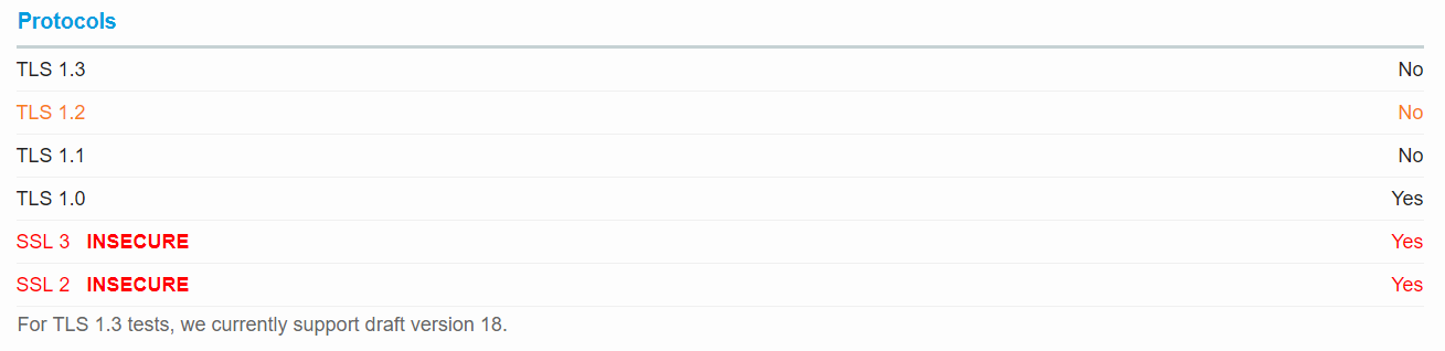 Als je niet zeker weet welke protocollen jullie site ondersteunt, voer dan onze gratis SSL-servertest uit. Ga naar het gedeelte Protocollen van de pagina met resultaten; dan zie je een lijst met alle protocollen en ook of deze wel of niet momenteel zijn ingeschakeld. Hieronder zie je een duidelijk voorbeeld van een slecht geconfigureerde site, want deze ondersteunt nog steeds SSL 2.0, SSL 3.0 en TLS 1.0 maar niet TLS 1.2.