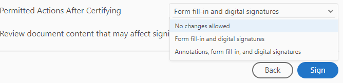 Het certificeren van een document geeft je dus meer controle over welke inhoud na de ondertekening kan worden toegevoegd. Na het certificeren zijn er eigenlijk drie mogelijke handelingen: