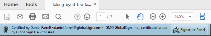 Voor gecertificeerde documenten wordt een blauw lintje weergegeven aan de bovenkant van het document. Dit bevat de naam van de ondertekenaar, zijn bedrijf en de uitgever van het certificaat – dit is een duidelijk, visueel bewijs van de echtheid en auteur van het document.