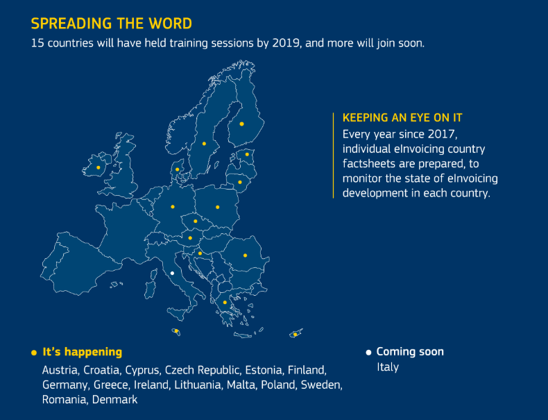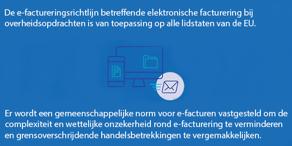 Vanaf 18 april 2019 – de deadline voor de omzetting van de richtlijn in nationale wetgeving van de EU-landen – moeten overheidsinstanties die overheidsopdrachten uitschrijven in de EU voldoen aan de Europese standaard inzake elektronische facturering en in staat zijn om elektronische facturen correct te ontvangen en verwerken, met als resultaat een vlotte stroom binnen de EU.