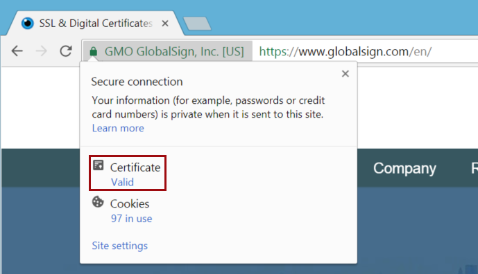 1. Als u op het hangslot klikt, wordt de certificeringsautoriteit die het certificaat heeft afgegeven weergegeven (“GlobalSign heeft deze website geïdentificeerd als:”) plus een opmerking dat de verbinding met de server is versleuteld. Er is ook wat informatie over de identiteit, maar ook dit hangt af van het soort certificaat: EV vs. niet-EV (DV of OV). EV-certificaten bevatten de bedrijfsnamen en locatie, maar bij DV en OV wordt alleen het domein vermeld.