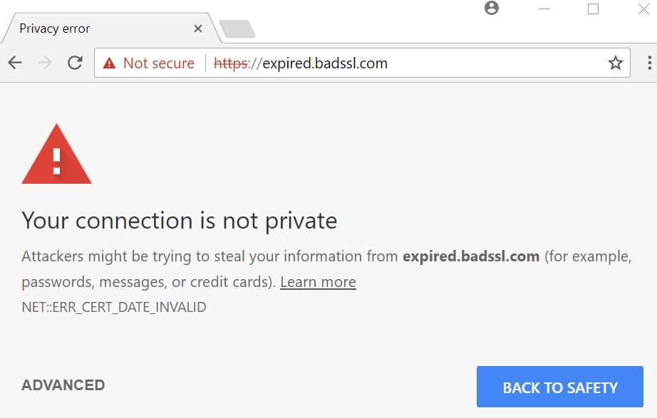 Voorbeeld van site met vervallen SSL-certificaat in Chrome.