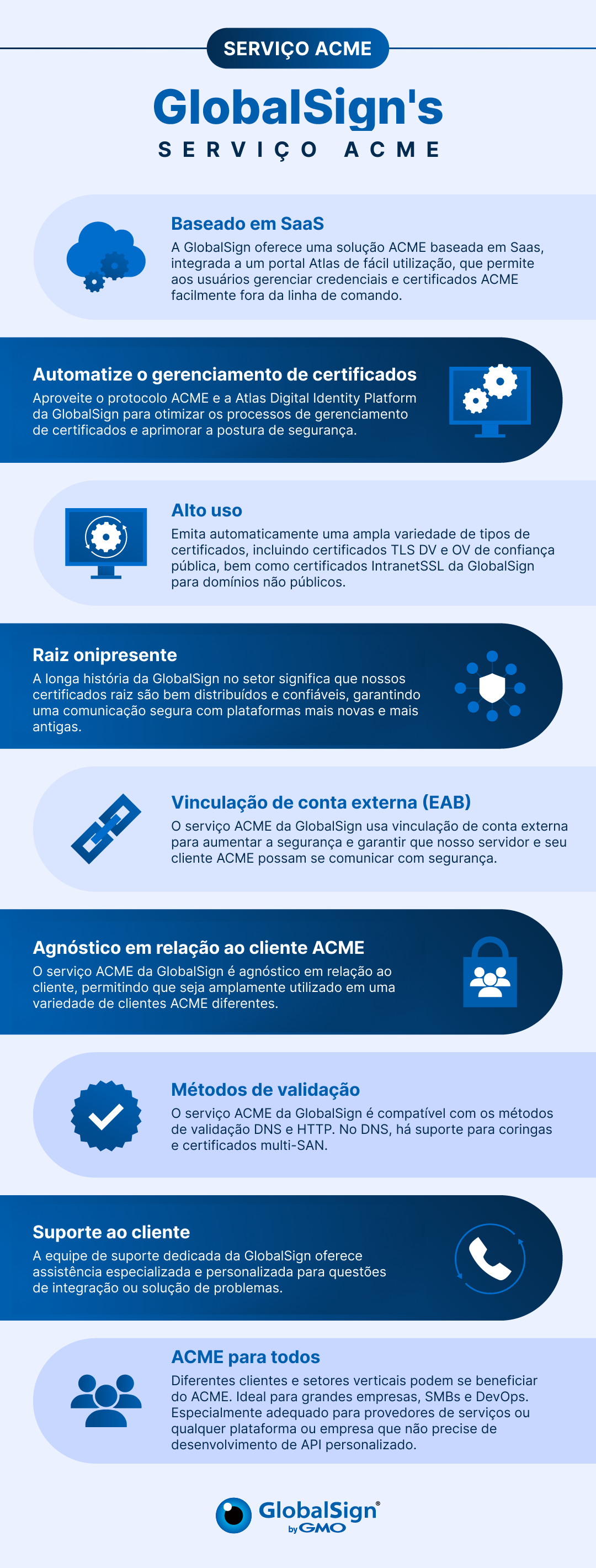 Os ciclos de vida dos certificados estão ficando mais curtos. A melhor maneira de gerenciar um portfólio de certificados em constante crescimento e evolução é automatizá-lo. O protocolo ACME é ideal para otimizar e automatizar processos de gerenciamento de certificados e aprimorar a postura de segurança, especialmente se você precisar mudar rapidamente diante de uma mudança ou incidente no setor. O serviço ACME da GlobalSign elimina o incômodo do Gerenciamento do Ciclo de Vida do Certificado (CLM) - aqui estão algumas razões pelas quais nos destacamos da multidão: