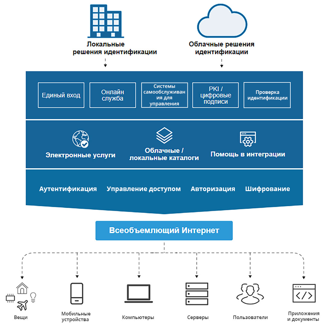 Наши решения по идентификации и безопасности основаны на надежной инфраструктуре, соответствующей требованиям и стандартам WebTrust, которая включает в себя центры обработки данных по всему миру, отличается большим запасом мощности, высоким уровнем доступности, инструментами мирового уровня для защиты сети, а также высокой масштабируемостью, необходимой для быстро растущего рынка Всеобъемлющего интернета, оборот которого оценивается в 14,4 трлн долларов США. Мы создаем общественные доверенные и приватные иерархии PKI и службы IAM на базе наших облачных служб и локальных систем. Мы обеспечиваем прямую интеграцию с локальными и облачными каталогами, клиентскими и партнерскими базами данных, корпоративными приложениями и сетями. Мы поможем выполнить ваши требования к уровню безопасности для любого устройства, услуги или пользователя.